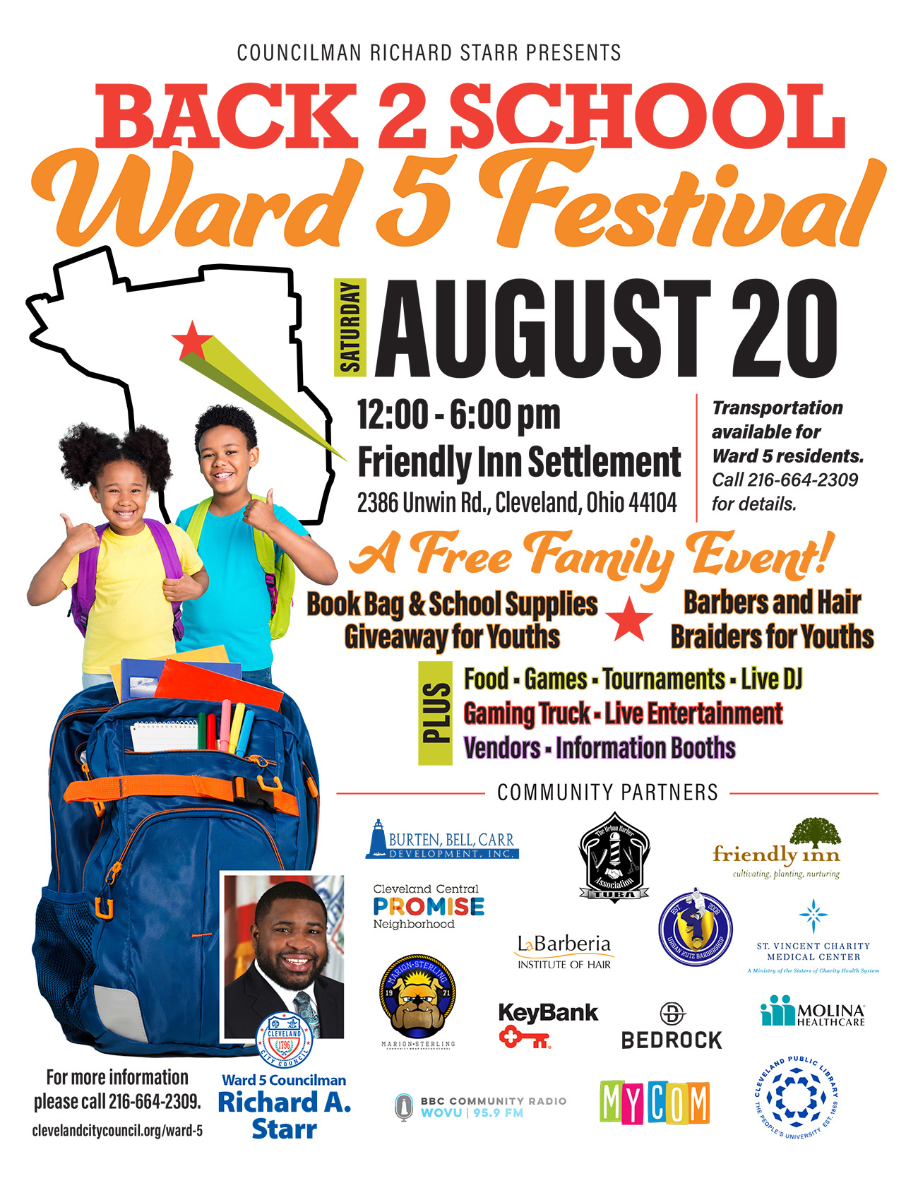 Councilman Richard A. Starr invites Ward 5 residents and friends to this FREE, family event. For youth in attendance there will be school supplies giveaways, barbers, and hair braiders. There will also be vendors, food, entertainment, and much more at this festival.