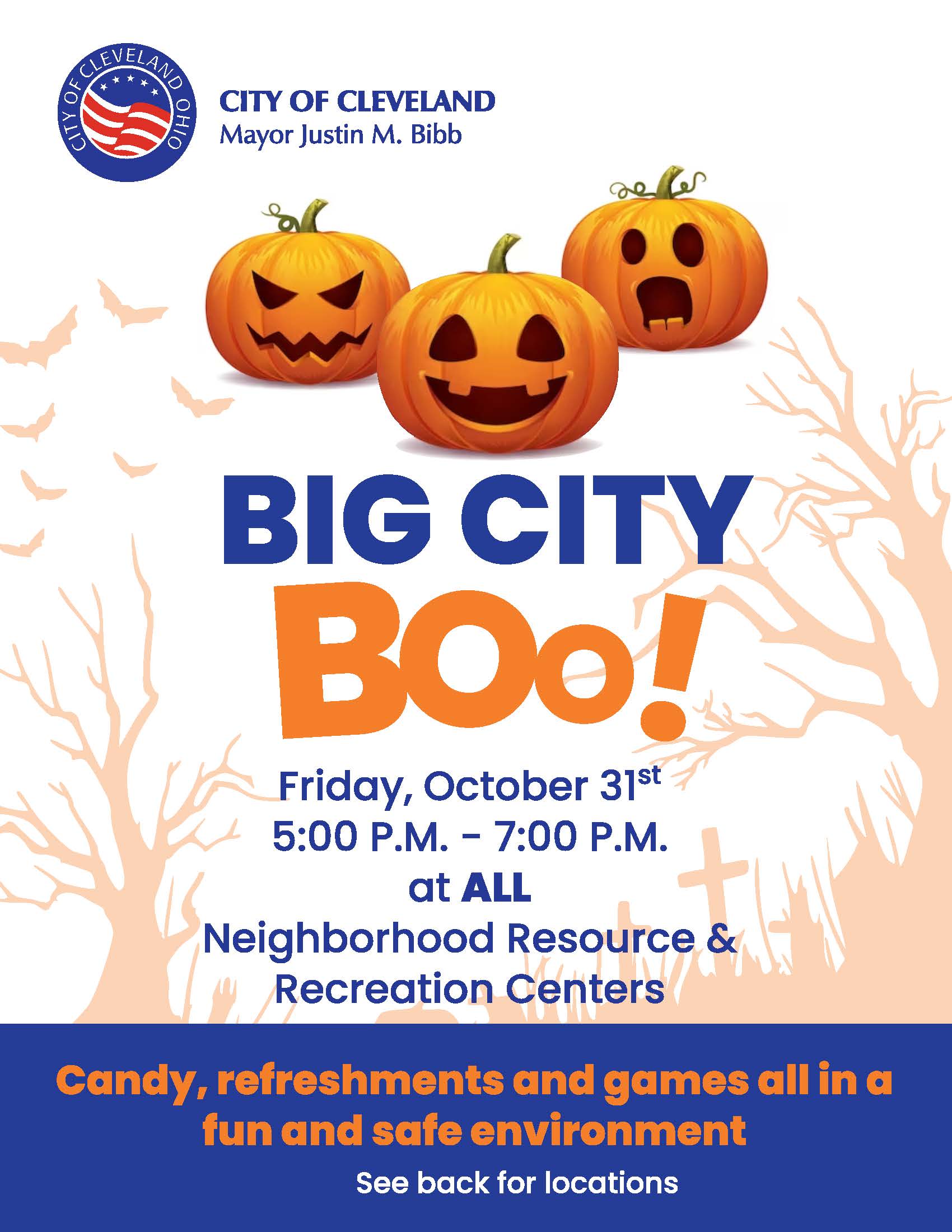 The annual Big City Boo celebration is at all Neighborhood Resource & Recreation Centers. Parents and caregivers can bring children to NRRCs to enjoy candy, costumes, music, games, and much more! Reminder, the general door-to-door residential trick-or-treating is from approximately 6:00 PM to 8:00 PM.