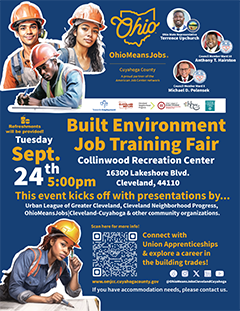 Council Members Mike Polensek and Anthony T. Hairston invite residents to attend this job training fair presented by Ohio Means Jobs. Come learn about Union apprenticeships and exciting careers in the building trades.