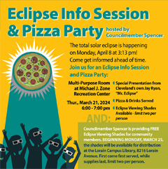 In preparation for the April 8th total solar eclipse, Council Member Jenny Spencer welcomes Ward 15 residents to an Eclipse Info Session & Pizza Party.
