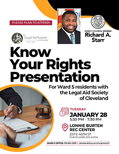 Councilman Richard A. Starr urges Ward 5 residents to attend this free presentation presented by the Legal Aid Society of Cleveland to learn more about your civil legal rights and access to justice.