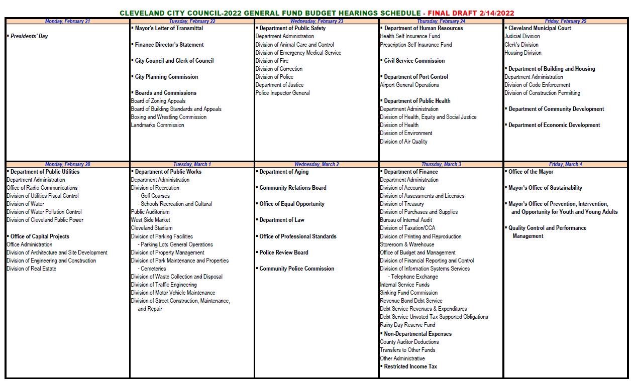 Here is the schedule for the budget. Be aware some departments may take longer, pushing others back or others may move more quickly and thus bring others up earlier. Watch live on www.tv20cleveland.com/watch-now/ or live or later on YouTube at www.youtube.com/user/clevelandcitycouncil. Also see below.