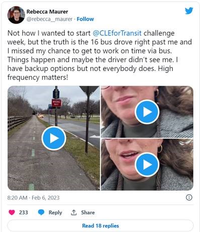 Cleveland City Councilwoman Rebecca Maurer, representing Ward 12, attempted to start the transit challenge on Monday last week, but watched as the bus “drove right past” her, she said in a post that