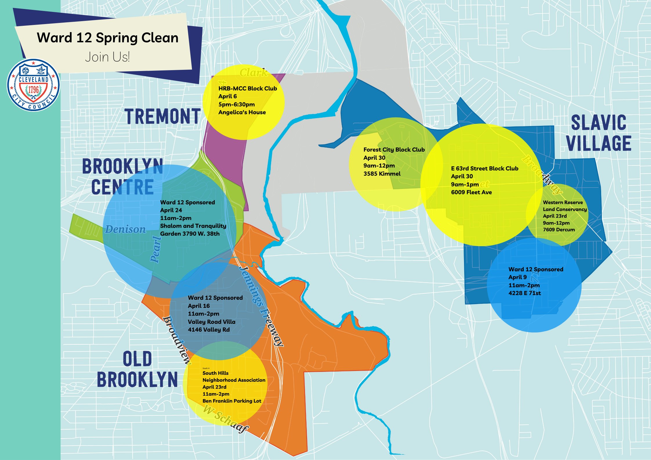 The Ward 12 office is proud to sponsor and support cleanups all over Ward 12 this spring. From Old Brooklyn to Slavic Village, Brooklyn Centre to Tremont, we are rolling up our sleeves and getting litter under control this spring. See the image below for upcoming dates and times.