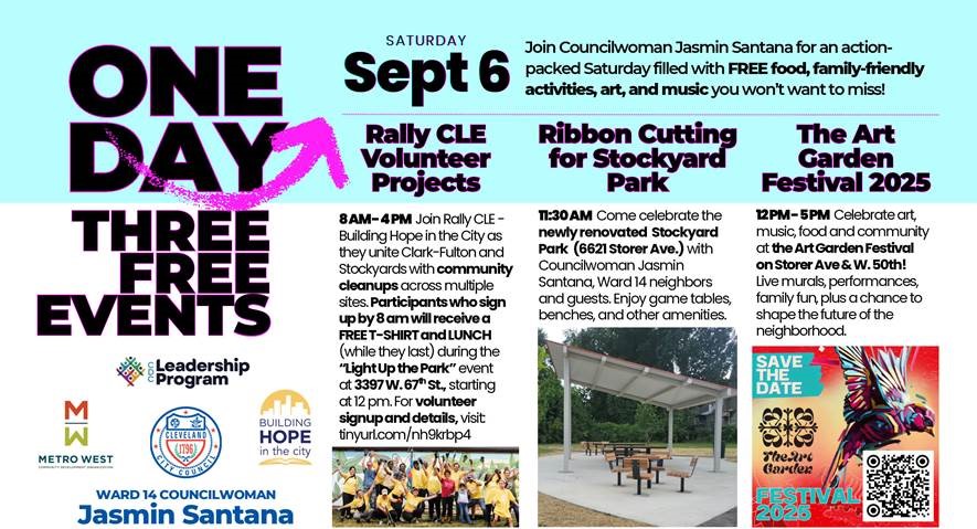 11:30 AM Celebrate the newly renovated Stockyard Park (6621 Storer Ave.) with Councilwoman Jasmin Santana, Ward 14 neighbors, and guests. Enjoy game tables, benches, and other amenities.