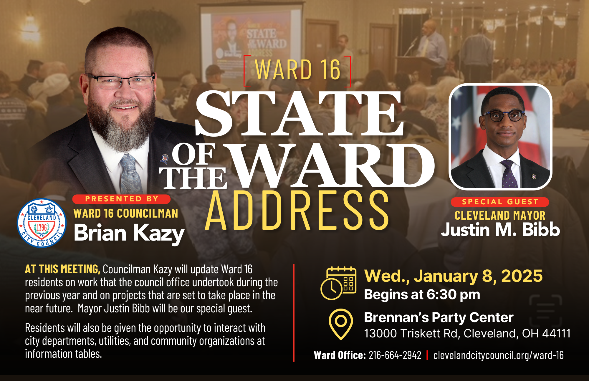 At his annual address, Councilman Kazy will update Ward 16 residents on work that the council office undertook during the previous year and on projects that are set to take place in the near future. Mayor Justin Bibb will be our special guest.